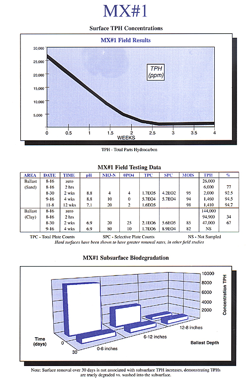 M.X. #1 is a proprietary blend of bacteria, nutrients and washing agents. The product is effective in removing oil stains in a relatively short period of time (normally within hours). After removal from the surface, M.X. #1 quickly biodegrades the displaced contaminants.